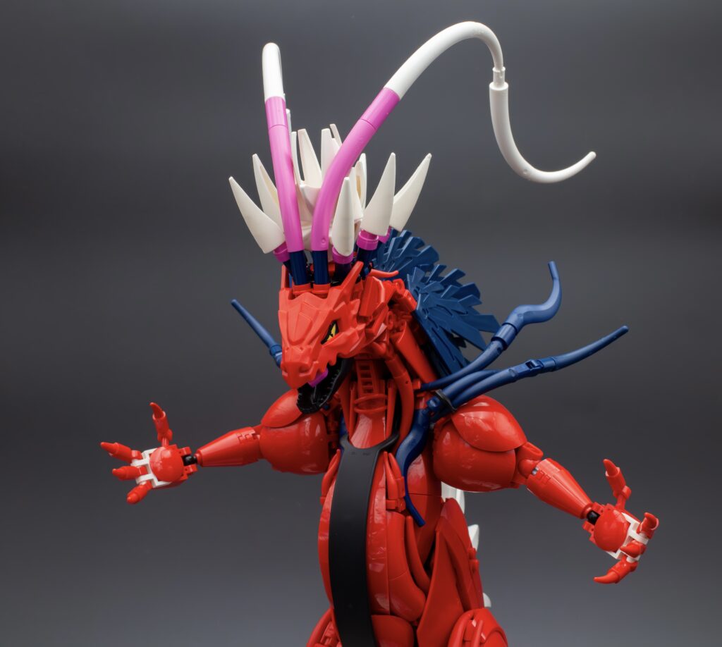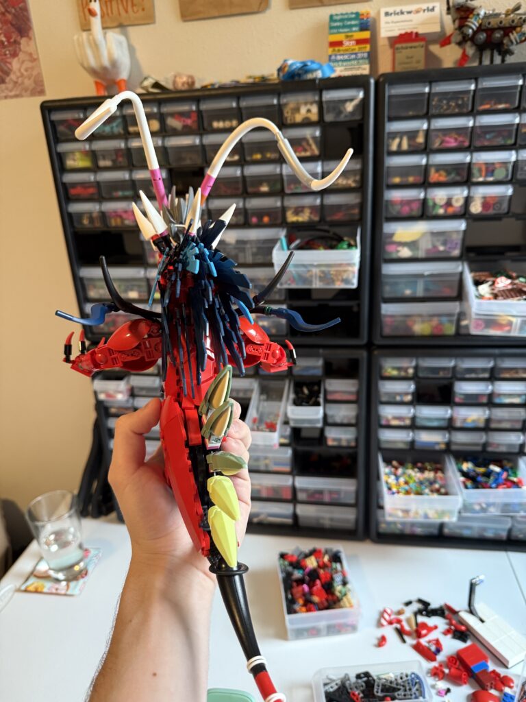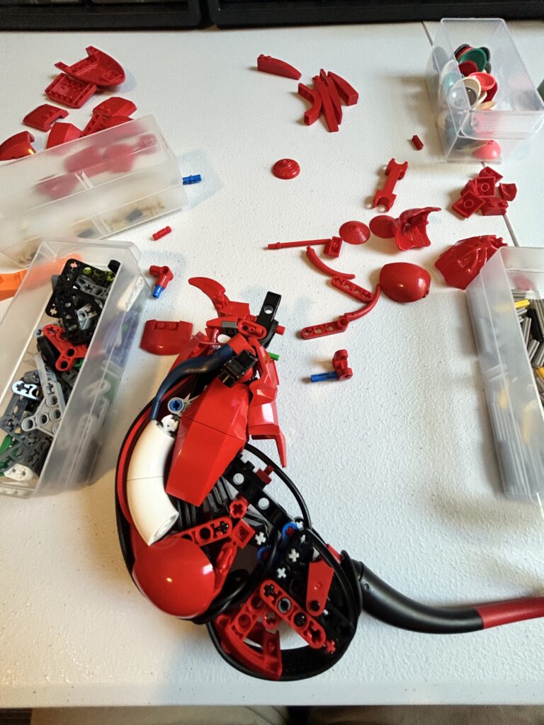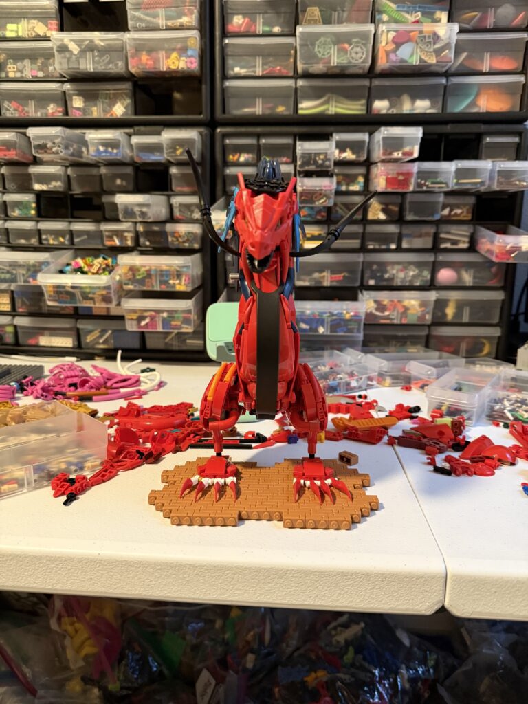 Although much more challenging than I had initially expected, my first draft was complete in no time. I had received feedback from many builders online helping me with part suggestions and giving me a lot of positive feedback. I felt like everything was going great, but in reality the build was going terribly. Ignoring the fact that it just didn’t look great, I reflect now that my vision for the project was all over the place. A large problem that had been brewing from the start was my lack of decision making. I never committed to fully making Koraidon, but I also never differentiated from the key features Koraidon has. This is where the name Koraidon(?) came from, and as can be seen in the final product, this issue lasted throughout the entire build process. From a technical standpoint, I was also all over the place. Although I knew the parts I “should” be using, I was executing things all wrong. I would often use parts that although a similar shape, had very different textures and curvature. In the end, my first attempt is brutal yet somewhat poetic to look back upon. Luckily, I was slapped into shape by some great friends that kept things 100% real with me. Positive reinforcement can be helpful, but left unchecked, I had convinced myself I knew what I was doing, when in reality I was completely lost.