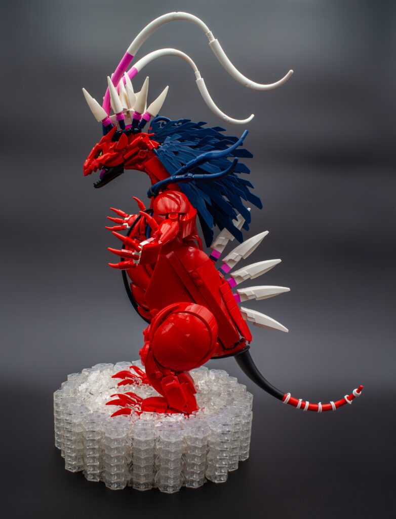 The origin’s of this build date back to Brickworld 2024, where I made a host of new friends from the Lego constraction community. After spending a whole weekend learning the dark arts and secrets on how to build creatures and characters, I was incredibly inspired to give it a shot! Specifically, some of my friend’s builds that inspired me included the vibrant colors of Aiden’s (@aiden.builds) Blyrakas, the dynamism of Michael’s (@J6Crash) Sagittarius, and the perfection of Nathan’s (@woomy_world) Karashishi. During convention tear down, they even showed me the internals of their builds and taught me how to use a variety of different techniques to capture a desired look. Overall, I was just itching to build something when I got home, but first I needed some Bricklink orders to acquire some of the constraction basics. In one of the orders, I was recommended by Nathan to grab the Ninjago Rising Dragon Strike head as well as the Ninjago Firstbourne printed eyes. He had used these in his Tempura Dragon, and having a prefabricated head design was much easier for me to start out on. After putting the combo together, I realized a very vague resemblance to the relatively new legendary Pokémon Koraidon, and the concept was formed.